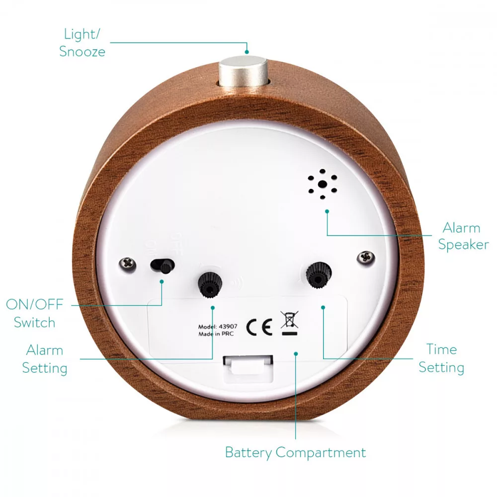 Захранван от една AA батерия (не е включена), безшумен дървен часовник работи бързо. На гърба има три контроли за задаване на часа, часа на алармата и друг ключ за включване или изключване на алармата. Когато алармата прозвучи, трябва само да натиснете светлинния бутон, за да спрете алармата.