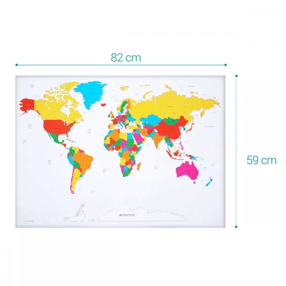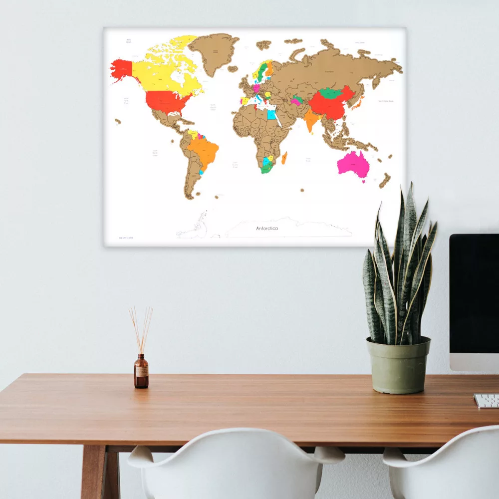 Картата е покрита с тънък слой, който може лесно да се издраска, за да се подчертаят местата, които сте пътували. Това е вълнуващ начин да организирате спомените си и да планирате следващите си приключения. Живият цвят и прецизните детайли на картата я правят не само полезна, но и естетична, превръщайки я във впечатляваща декорация за всяка стая.