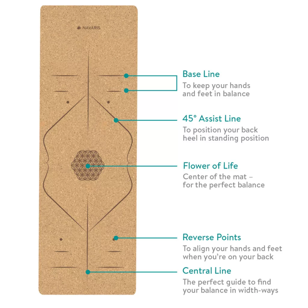 Saltea yoga Navaris Cork, 183x61x0.5 cm, linii de aliniere, aderenta naturala, bej, pluta/TPE