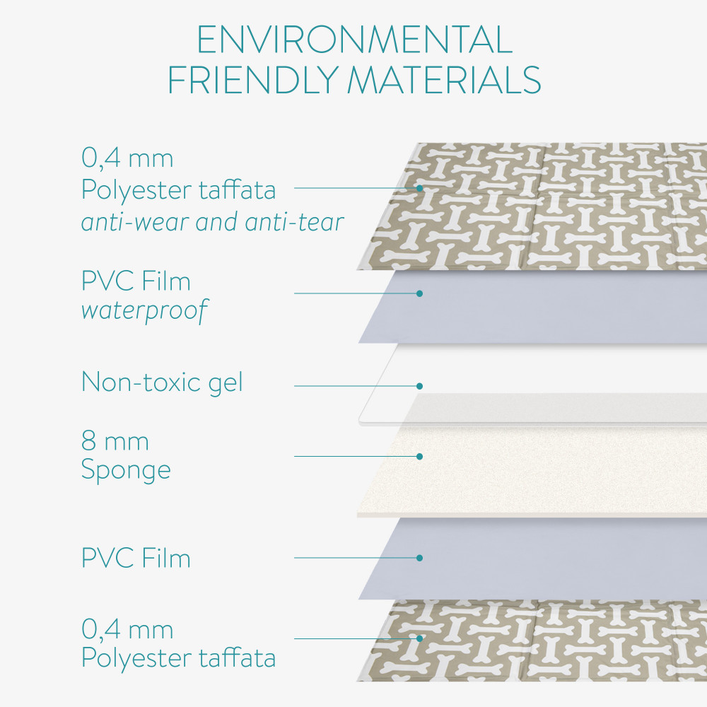 Килимът има слой от пяна вътре, който гарантира, че гелът не се измества под тежестта на вашия домашен любимец (максимално тегло: 20 кг). Здравата найлонова външна част предотвратява течове.