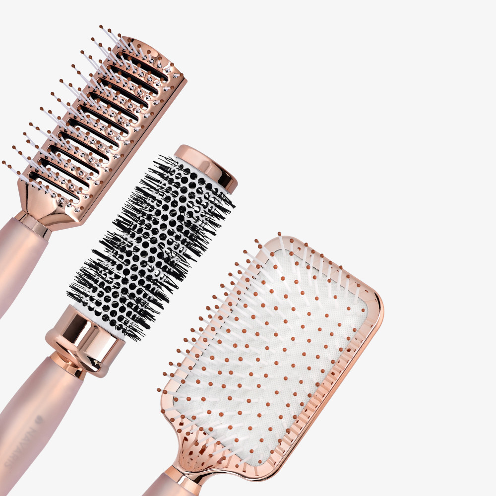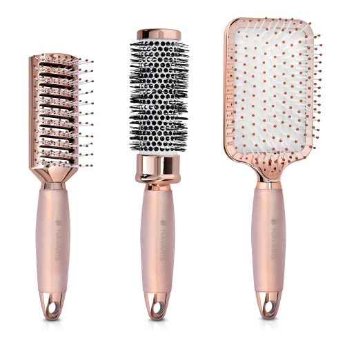 Розовото златно покритие на този комплект от 3 четки за коса им придава елегантен и стилен завършек. Правейки ги не само невероятно практични, но и невероятно стилни.