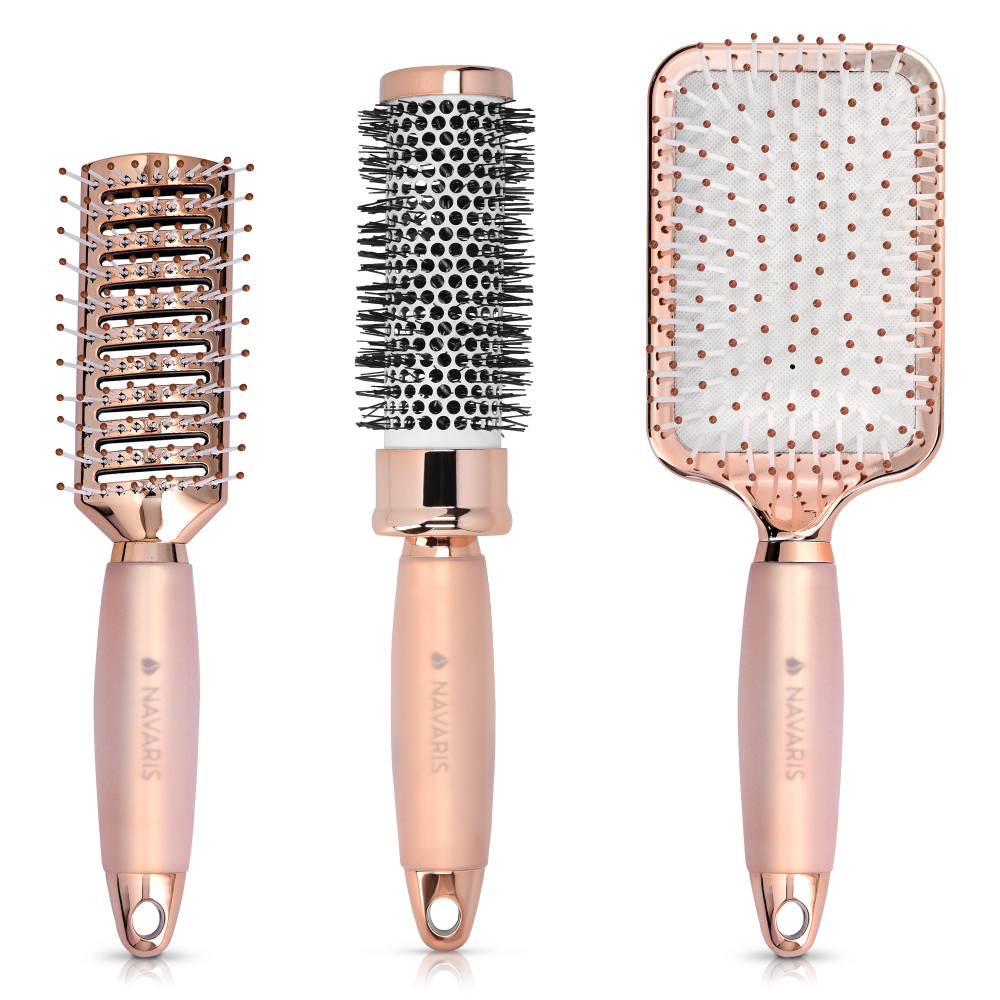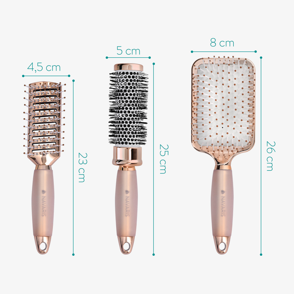 Помогнете на косата си да изглежда свежа с този комплект четки за коса от 3 части от Navaris, включващ четка с гребец, четка за вентилация и кръгла четка, всички предназначени да ви помогнат да постигнете желания стил.