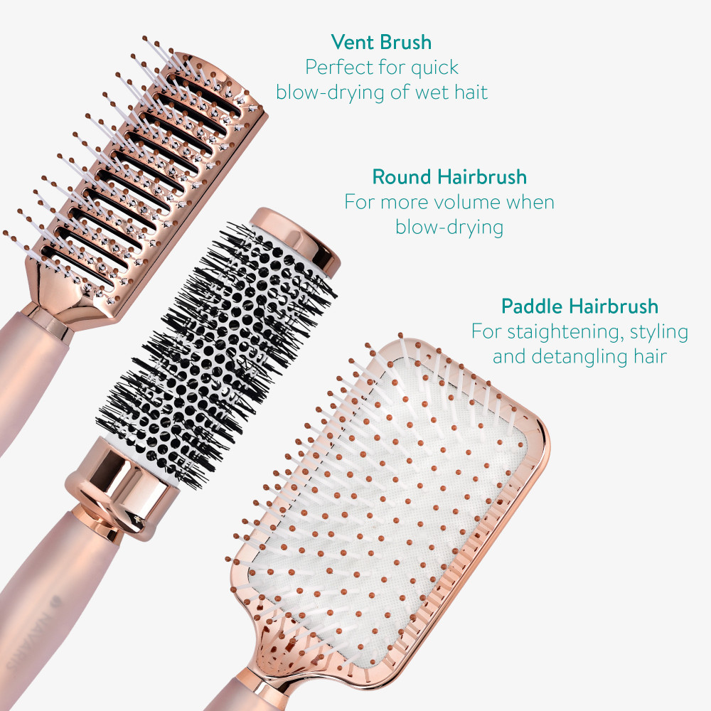 С 3 различни четки; вентилирана четка, кръгла четка и четка с гребло, ще имате пълен комплект четки за оформяне, които да ви помогнат да постигнете вида, който искате.