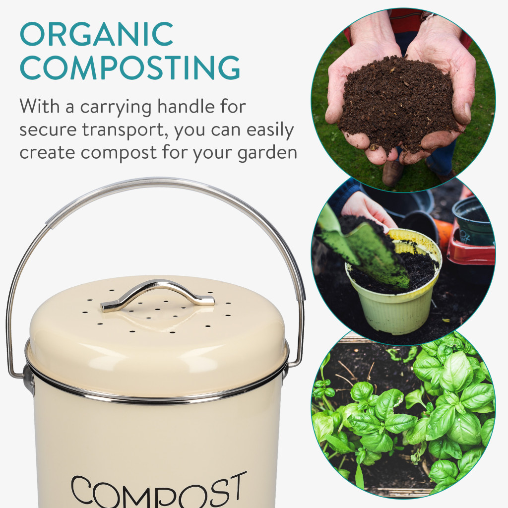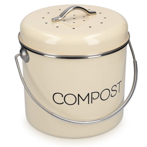 Cos de compost Navaris, 5 L, cu maner si filtru carbon activ, pentru bucatarie, crem, metal