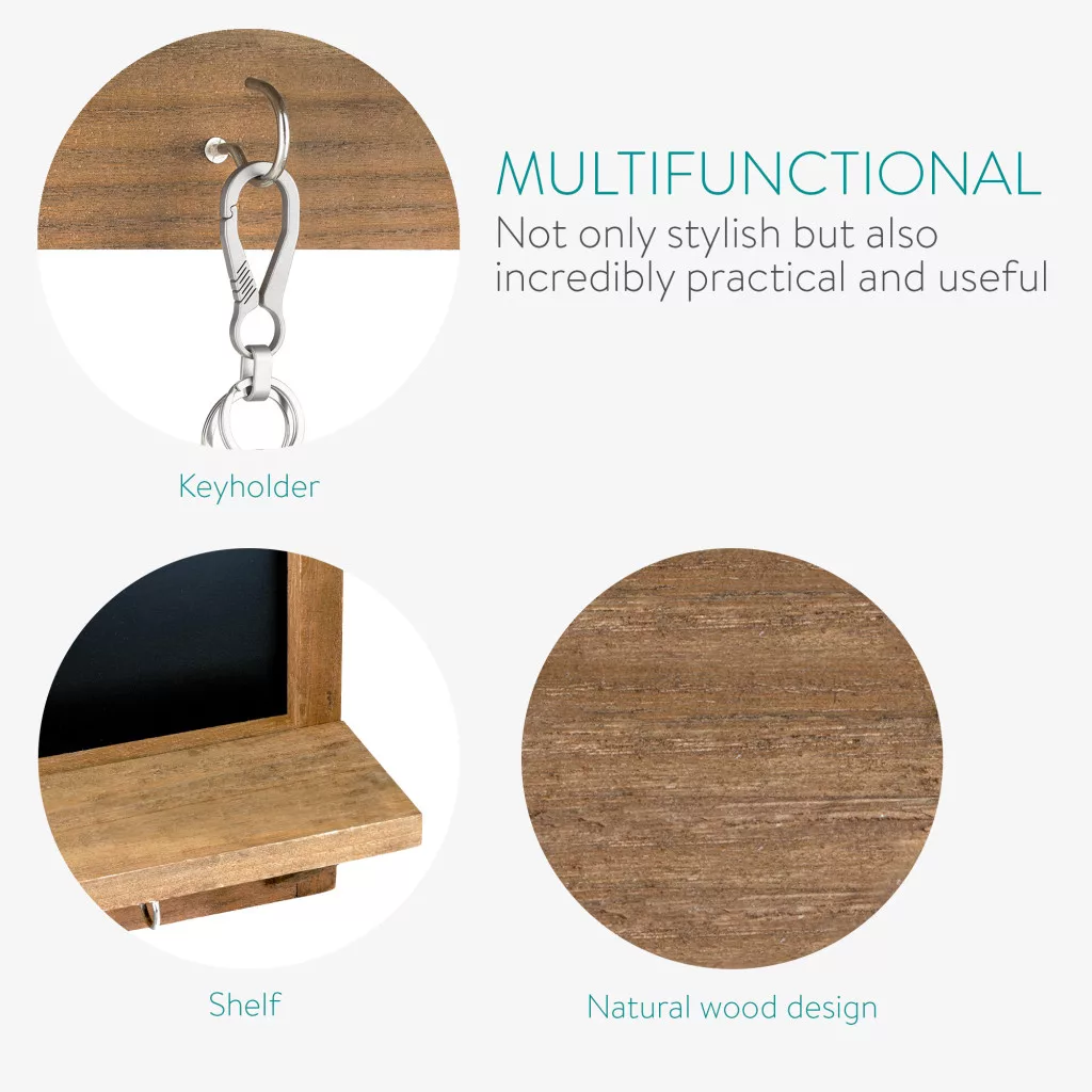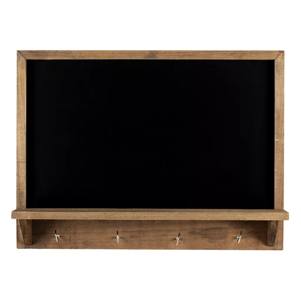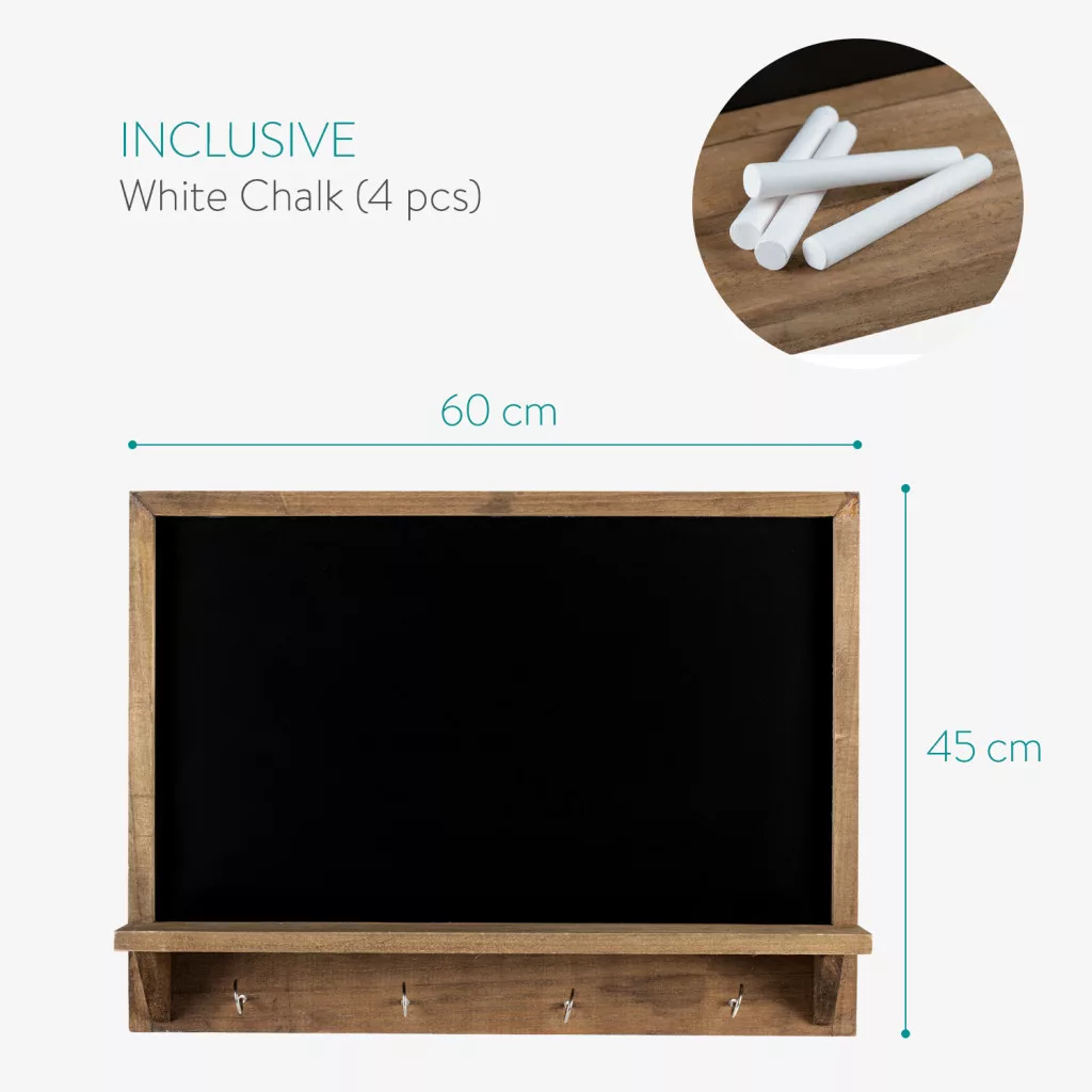 Tabla cu rama vintage Navaris, 60x45 cm, 4 carlige si polita, cu creta, negru, lemn