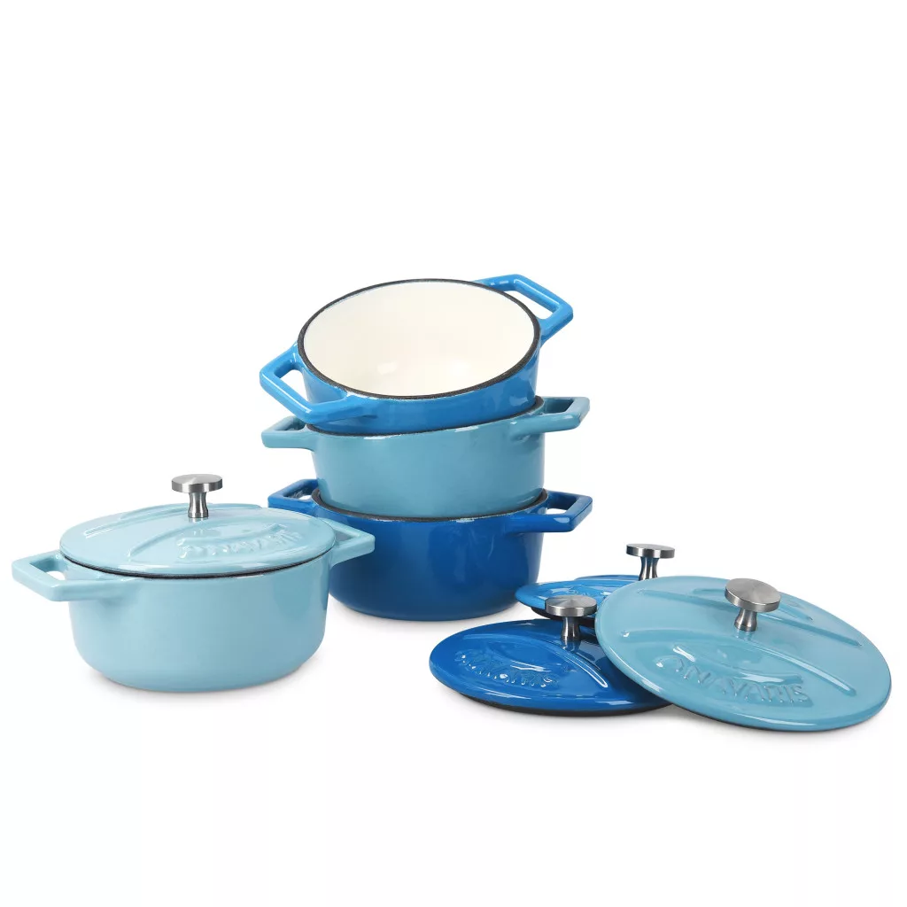 Комплектът от 4 мини чугунени тенджери Navaris е идеален за индивидуални порции, гратени, суфлета или паста във фурната. Капаците от неръждаема стомана и емайлираното покритие предотвратяват залепването на храната и улесняват почистването. Елегантен дизайн и син цвят, подходящ за всяка кухня и за фурна до 260°C.