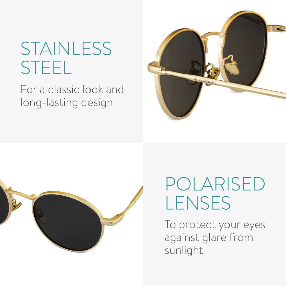 Унисекс слънчевите очила Navaris с пилотски стил са идеални за защита на очите ви от вредните ултравиолетови лъчи. Поляризираните лещи намаляват отблясъците и подобряват визуалната яснота, осигурявайки комфортно изживяване дори при условия на ярка светлина. Този елегантен модел, с класически дизайн, подхожда на всяка форма на лицето, като е идеален аксесоар за различни поводи.