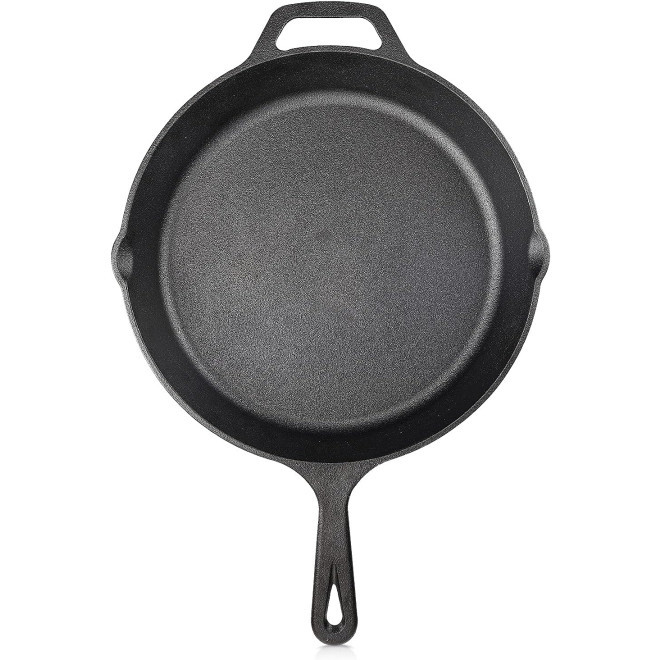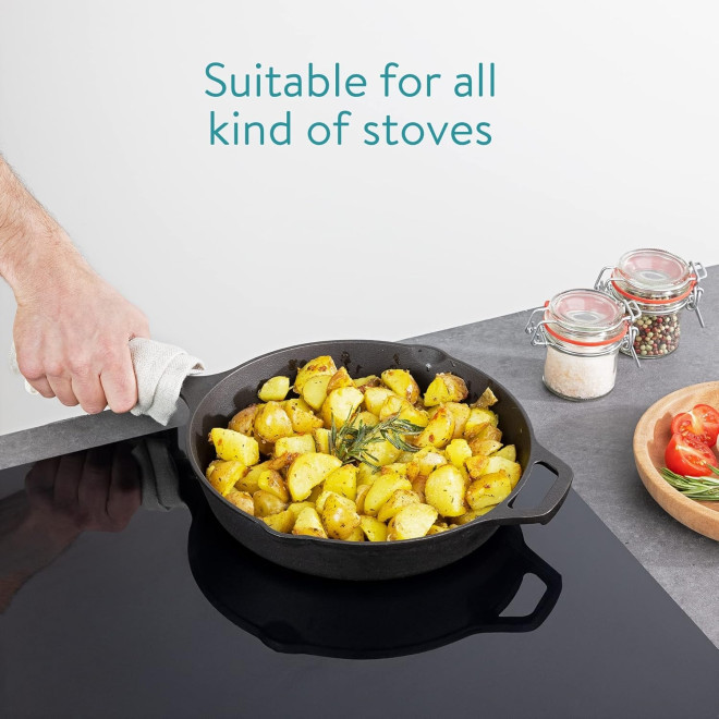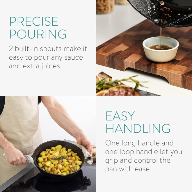 Чугунът е идеален за задържане на топлината и може да се използва за готвене, пържене, печене, гриловане, на котлона, във фурна или дори на открит огън. Има две изливни канали за лесно наливане на сосове и сокове.