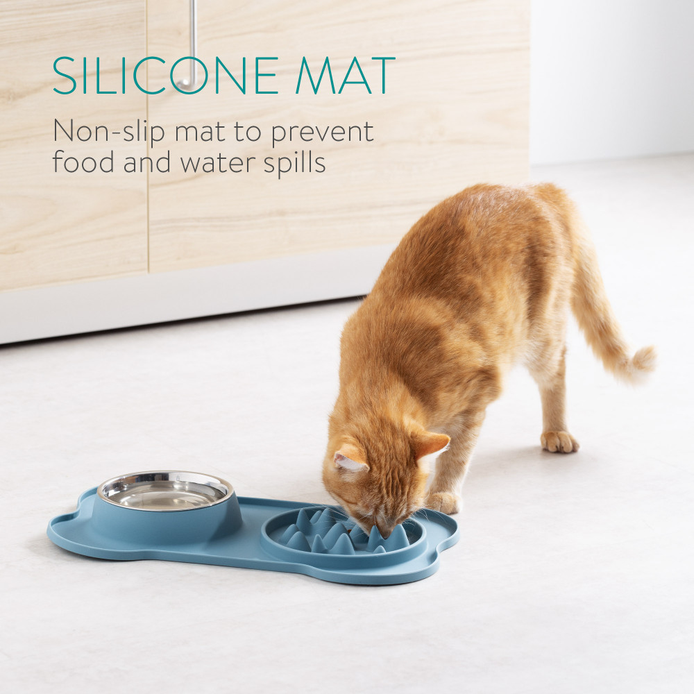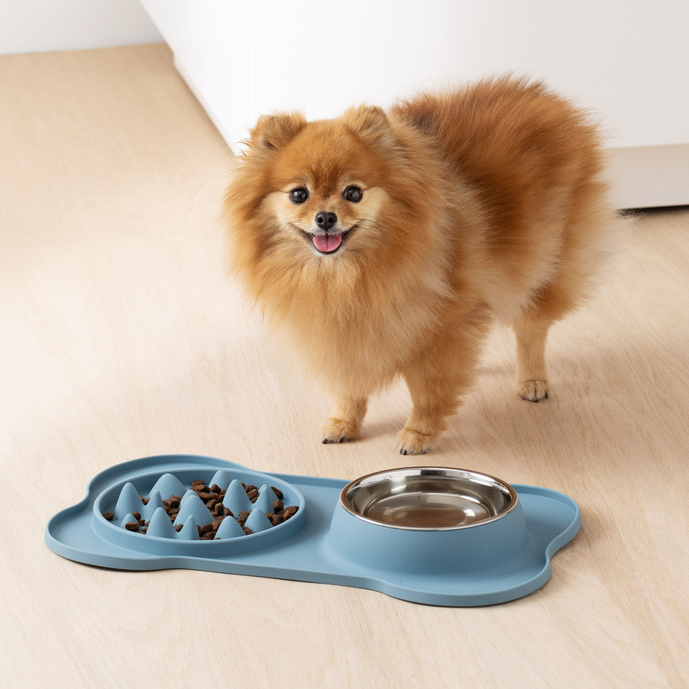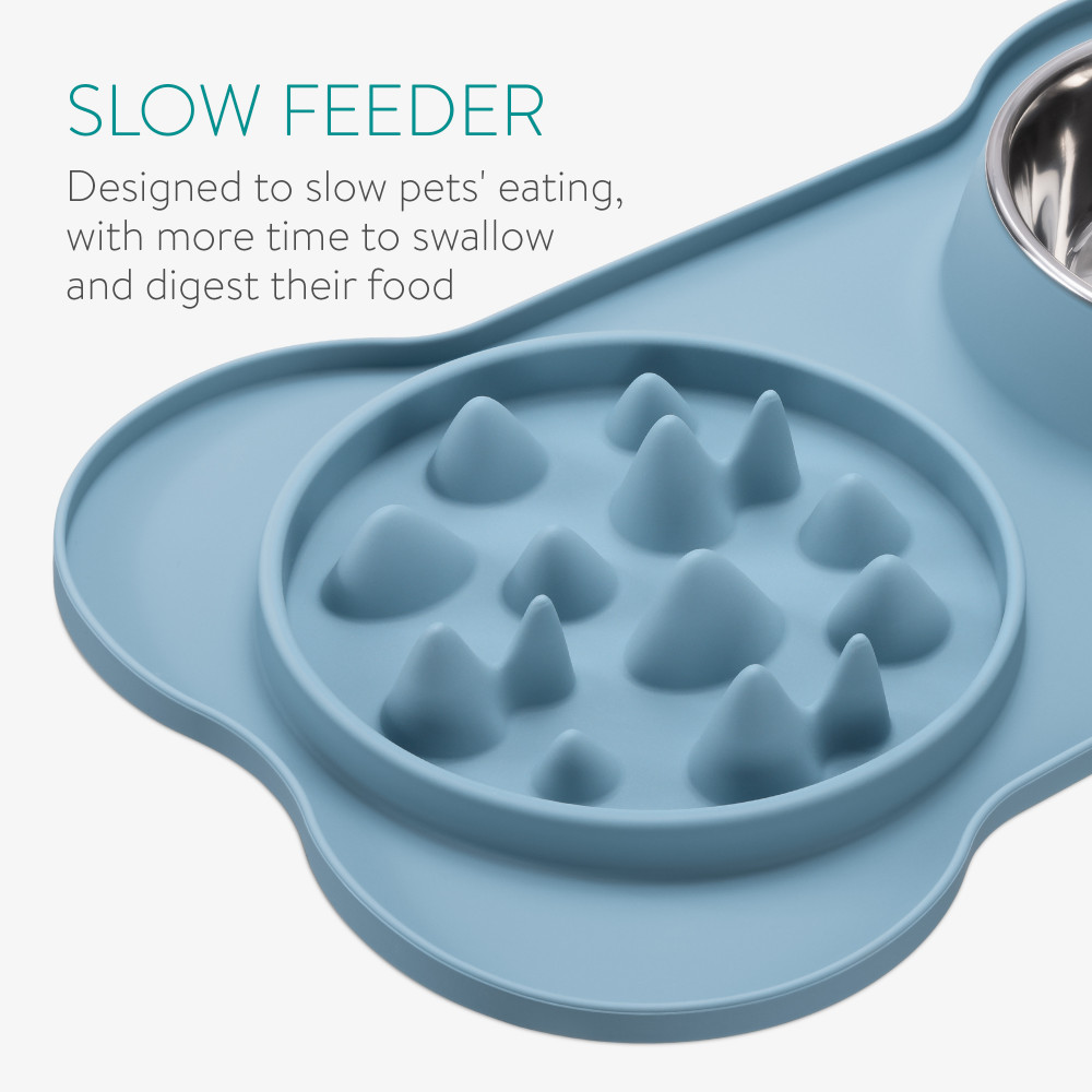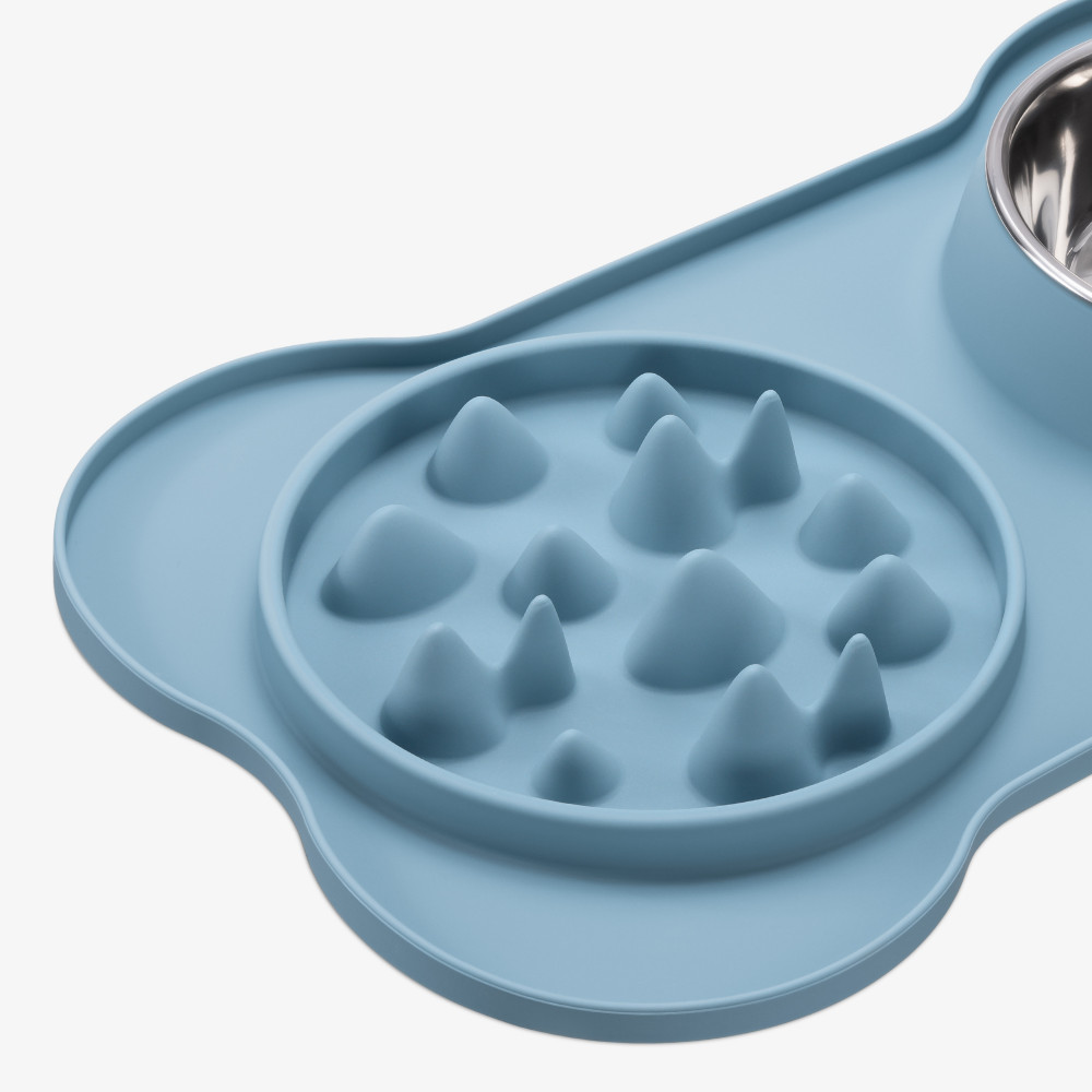Бавното захранващо устройство от едната страна на постелката има ъгли и ъгли, които разпределят храната наоколо. Домашните любимци трябва да заобикалят тези препятствия, за да стигнат до храната, като се движат със скоростта, с която могат да ядат.