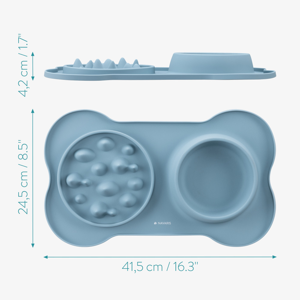 Подложката за бавно хранене Navaris и вградена купа за вода е иновативно решение за хранене на кучета и котки. С размери 42 x 25 см и елегантен син цвят, тази постелка е идеална за насърчаване на домашните любимци да се хранят по-бавно, като по този начин предотвратява бързото поглъщане на храна и проблеми с храносмилането. Вградената купа за вода също гарантира, че вашият домашен любимец има всичко необходимо, за да остане хидратиран по време на хранене.
