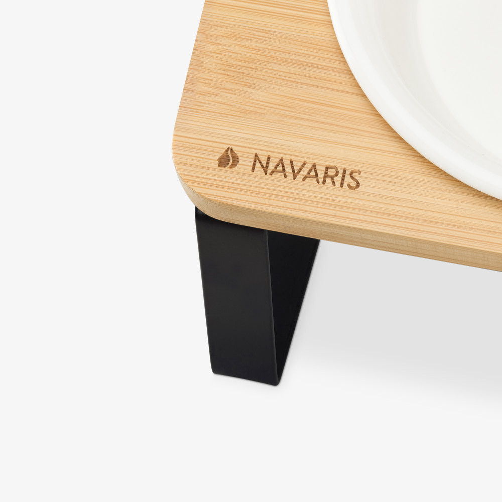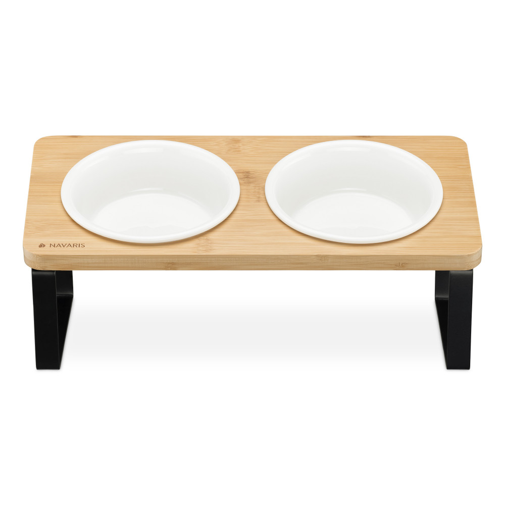 Нахранете и напойте вашия домашен любимец със стил и комфорт с тази повдигната станция за хранене с 2 керамични купи, повдигнати в стойка от желязо и бамбук.