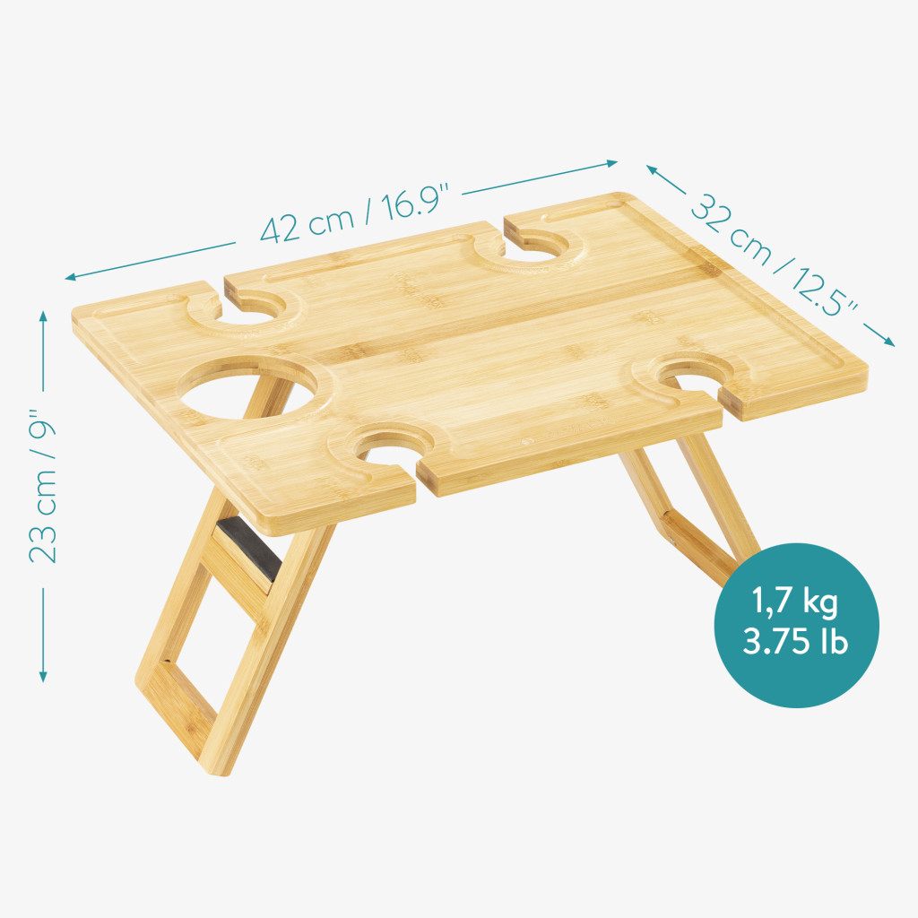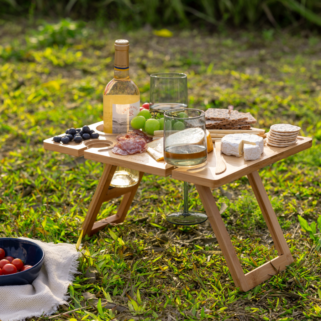Подобрете преживяването си на пикник с преносимия сгъваем плот Navaris, изработен от висококачествен бамбук. Идеален за пикници, събития на открито или романтични срещи, предлагащ място за до 4 чаши и бутилка вино.