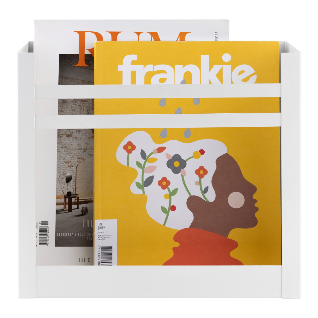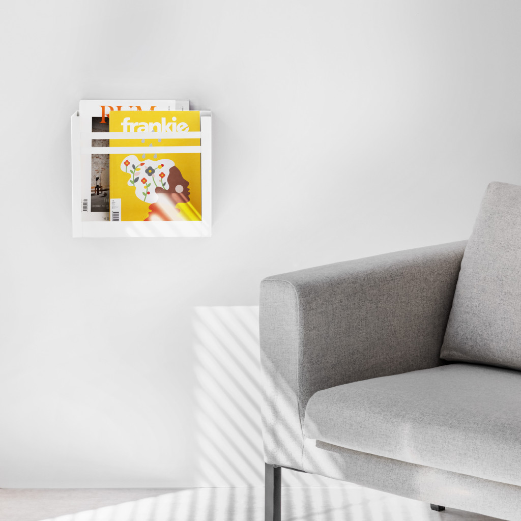 Suport reviste pe perete Navaris, 30x27x11 cm, capacitate 10 kg, alb, metal