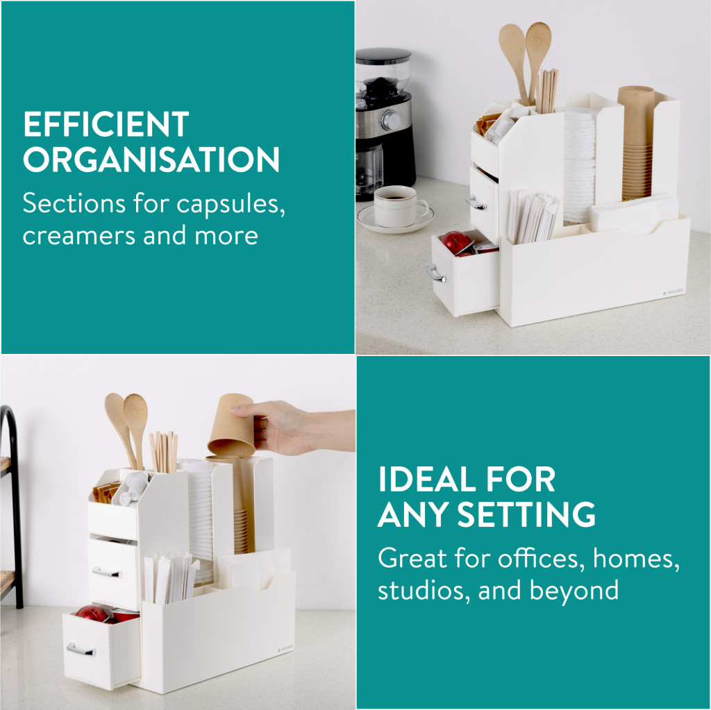 Organizator accesorii cafea Navaris, cu sertare, 31.5x13.7x28.7 cm, alb, plastic