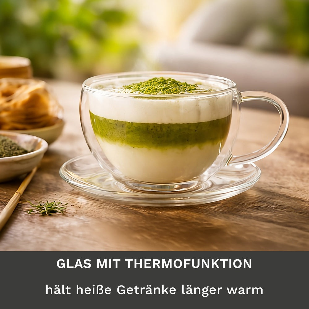 Cana termica Creano, 250 ml, sticla borosilicata, perete dublu, cu farfurioara