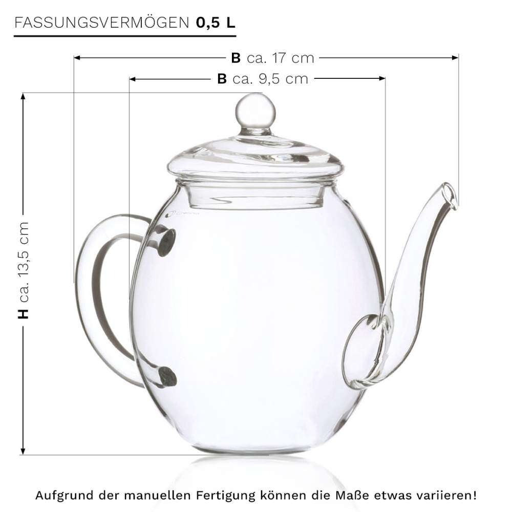 Чайникът от боросиликатно стъкло (прибл. 0,5 л / 500 мл) е избран именно за да подчертае запарването. Прозрачното стъкло показва ясно цветето и цвета на чая, а формата е проектирана за удобно наливане. Подходящ е и за ежедневна употреба, с лесно почистване.