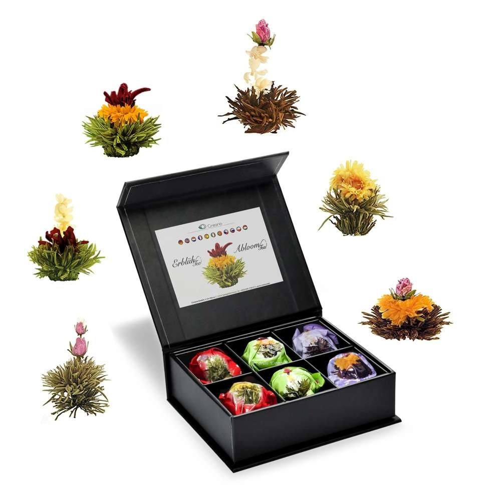 Подаръчният комплект Creano ErblühTee в черна магнитна кутия създава чаен ритуал, който се вижда: всяко топче се разтваря постепенно в горещата вода и разкрива цвете, за елегантно и запомнящо се поднасяне. В пакета ще намериш 6 топчета цъфтящ чай – микс от бял, черен и зелен чай – за различни моменти от деня.