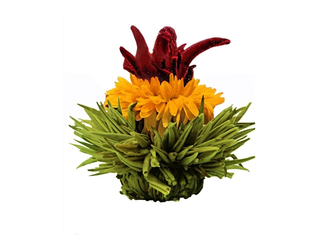 Миксът включва бял, черен и зелен чай, допълнени от цветя като невен, роза, жасмин, хибискус и (според разновидността) аромати за плодовите нотки. Съхранявай топчетата на хладно и сухо място, далеч от влага и силни миризми.