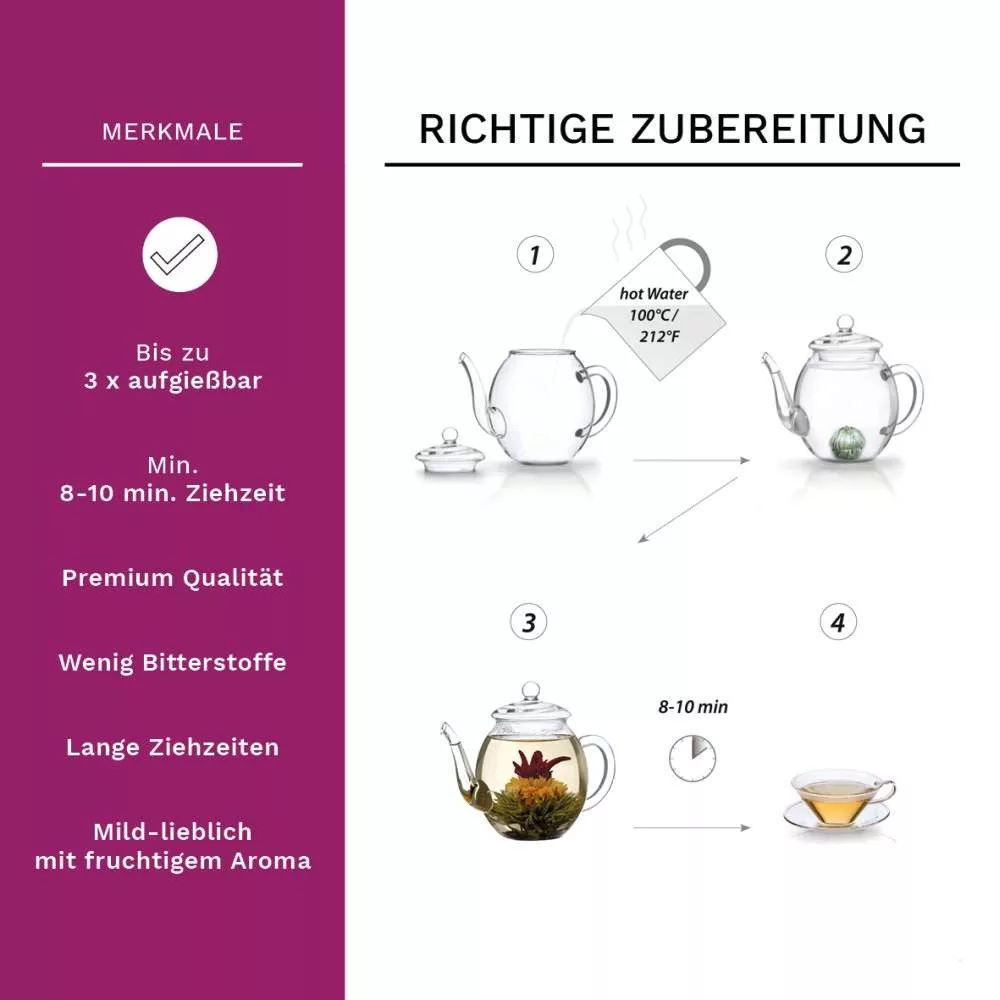 Ceainic din sticla Creano, 1 L, cu infuzor din inox, capac si 2 flori de ceai