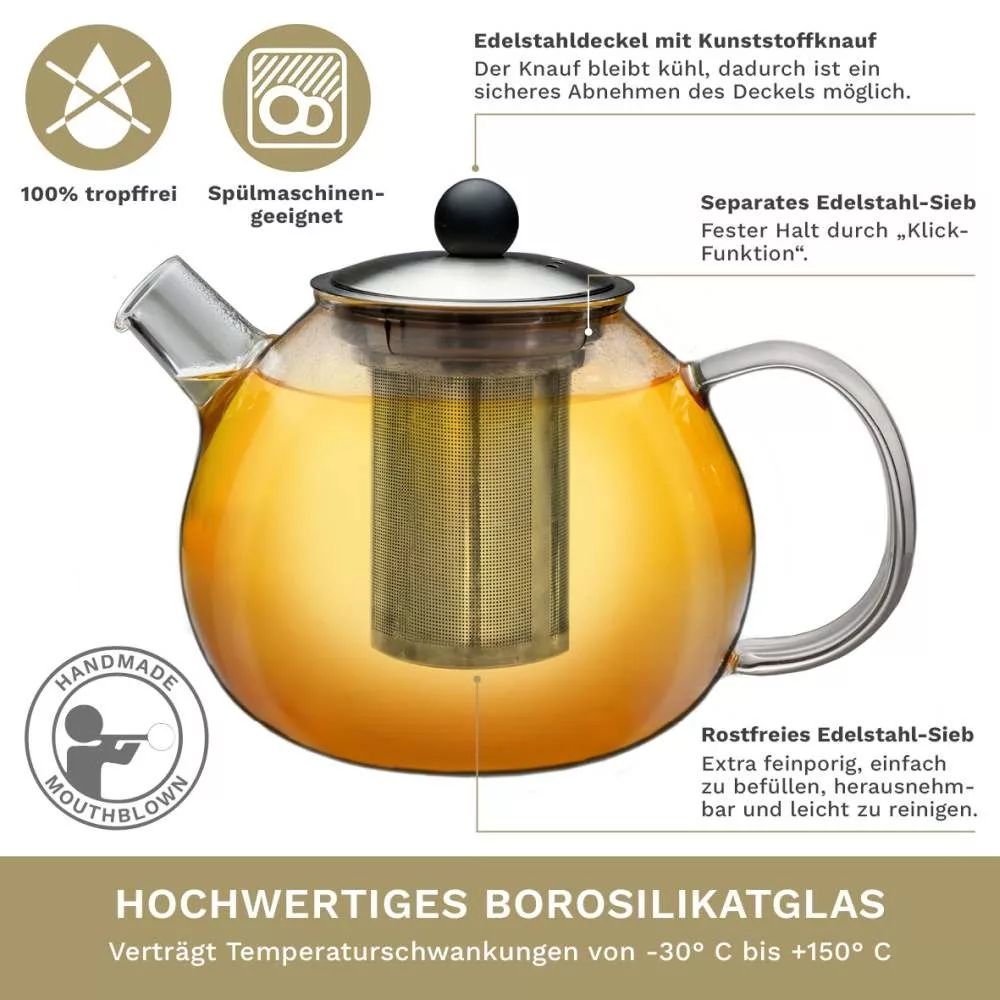 Ceainic din sticla Creano, 1 L, cu sita din inox si capac, pentru ceai vrac