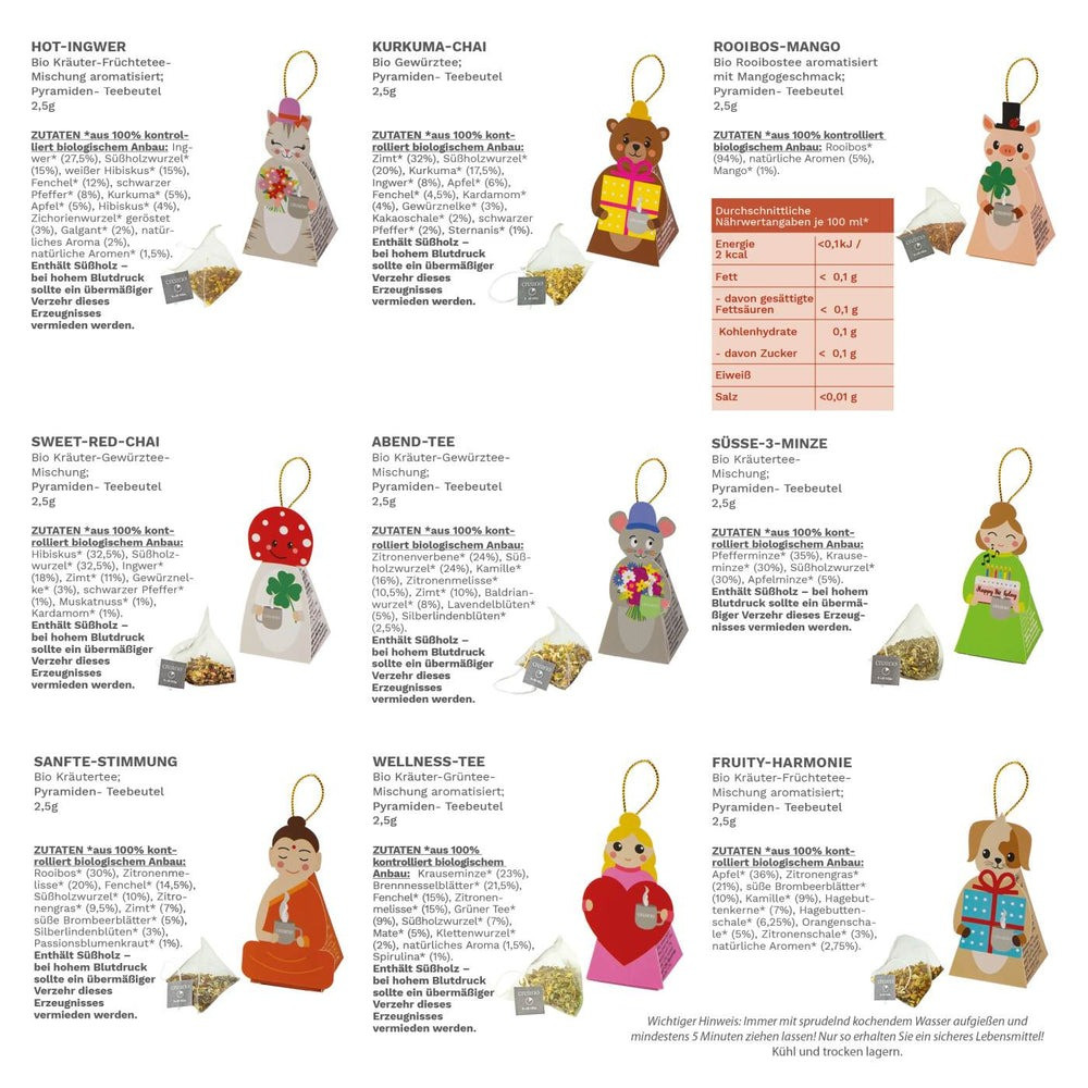 Комплектът включва 9 различни типа: Fruity Chamomile, Hot Ginger, Turmeric Chai, Rooibos Mango, Sweet Red Chai, Evening Tea, Sweet Mint, Gentle Mood и Wellness Tea. Всяко пирамидално пакетче е създадено да отделя ароматите си лесно във врялата вода, а формата „пирамида“ осигурява удобно запарване, без да претоварва чашата.