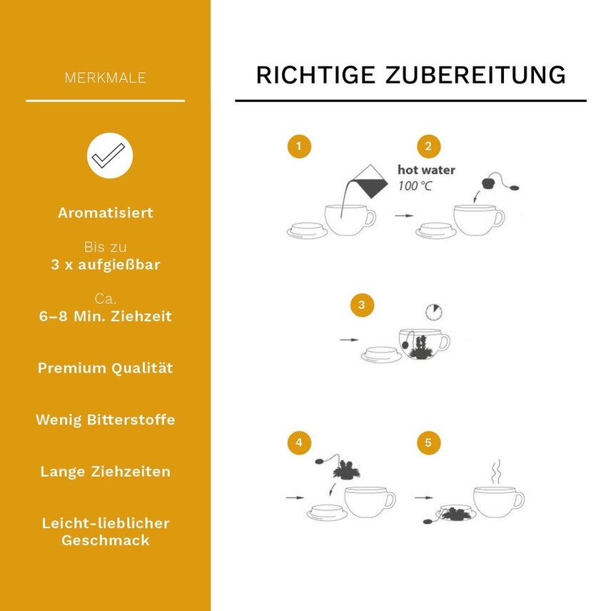 Форматът ErbluhTeelini е снабден с памучен конец за по-лесно изваждане след запарване. Използвай прясно кипнала вода и остави 6–8 минути; възможни са 2–3 запарвания, а пакетът съдържа аромати като жасмин, лимон, праскова и ванилия.