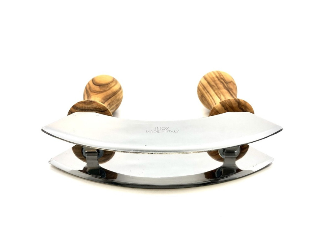 Ножът mezzaluna с дръжки от маслиново дърво е идеален за бързо и контролирано накълцване, когато искаш фини и равномерни парченца. Двойното острие от неръждаема стомана реже ефективно, а извитата форма позволява работа с люлеещи движения без усилие.